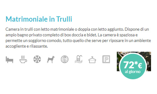 L'agriturismo mette a disposizione cinque camere, una delle quali adatta a portatori di handicap. Tutte le stanze sono dotate di condizionatore, bagno privato e ingresso indipendente. Inoltre, per coloro che preferiscono una vacanza più indipendente, c'è anche uno spazioso appartamento (6+2) composto da tre camere da letto, soggiorno, cucina e bagno. L'appartamento è arredato con gusto ed è fornito di biancheria e stoviglie, risulta ideale per famiglie e gruppi di amici. Una delle matrimoniali e l'appartamento si trovano all'interno di un tradizionale Trullo, un edificio antico che mantiene ancora la tipica atmosfera e si completa alla perfezione con i comfort moderni. Per leggere la descrizione dettagliata delle camere e dell'appartamento clicca sul pulsante.