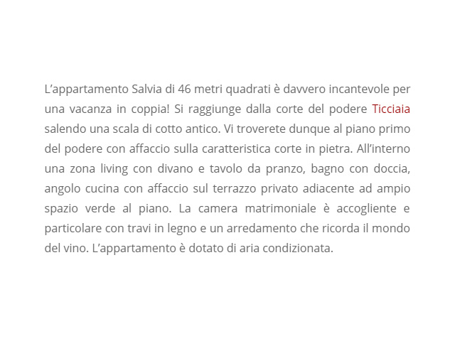 L'agriturismo offre ospitalità in undici appartamenti differenti che si trovano in due case coloniche recentemente restaurate: Podere Ticciaia e Podere Montarsiccio. Podere Ticciaia, una casa in stile Leopoldino che volge ad una vallata di boschi e vigneti, mette a disposizione aree comuni come la zona barbeque e il servizio wi-fi disponibile 24 ore. Gli appartamenti del podere Ticciaia, Salvia, Biancospino, Lavanda 1, Lavanda 2 e Ginepro, sono tutti dotati di aria condizionata e riscaldamento. Per leggere la descrizione dettagliata degli appartamenti clicca sul pulsante.