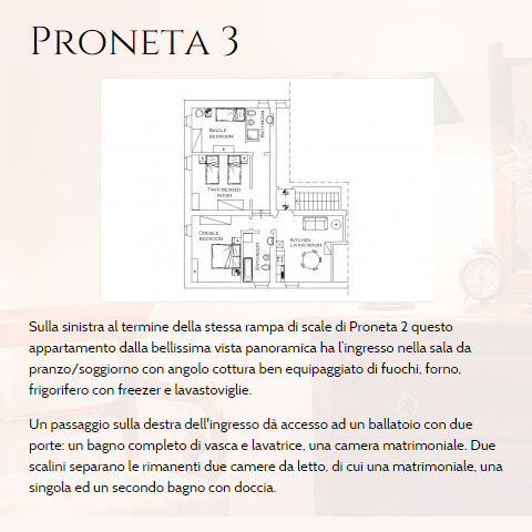Offriamo ospitalità all'interno di due corpi residenziali che si trovano all'interno del borgo rurale, "Podere Cappella" e "Villa Proneta". Sono distanti circa 300 mt l'uno dall'altro e conservano tutt'ora l'atmosfera suggestiva del passato. Dispongono entrambi di piscina panoramica e di spaziosi appartamenti. Gli ambienti interni sono curati nei minimi dettagli per garantire ai nostri ospiti un soggiorno confortevole in un'atmosfera d'altri tempi. Accanto a "Podere Cappella" troverete anche un campo da tennis. L'autenticità dei paesaggi e le caratteristiche della struttura ci rendono particolarmente adatti a famiglie con bambini. Per leggere la descrizione degli appartamenti clicca sul pulsante.