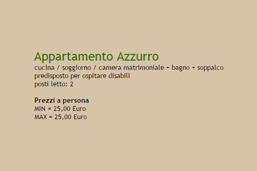 Mettiamo a disposizione ben sette appartamenti autonomi che possono ospitare fino a 25 persone. Ciascun alloggio è dotato di riscaldamento autonomo, biancheria per camera e bagno, zona giorno con angolo cottura, bagno privato interno ed accesso sull'ampio giardino comune. Gli appartamenti variano dai due ai cinque posti letto, potendo così soddisfare le esigenze di coppie, famiglie e gruppi di amici. Il trattamento offerto è di solo pernottamento o pernottamento con prima colazione. Per gli amanti della buona tavola abbiamo stipulato un accordo con un ristorante della zona dove potrete cenare e pranzare a breve distanza dalle nostre strutture.