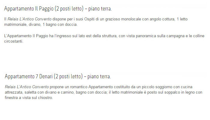 Il relais offre ospitalità in 7 appartamenti di charme di diversa tipologia e dimensione. Tutte le sistemazioni sono ben curate e luminose, hanno ingresso indipendente e offrono una splendida vista panoramica sulla valle circostante. Gli interni sono arredati in maniera sobria ed elegante e vengono caratterizzati da soffitti con travi a vista e pareti in pietra. I bagni hanno vasca o doccia e la rubinetteria si presenta con componenti in ottone, ceramica o ferro battuto. A disposizione degli ospiti riscaldamento autonomo, camino, cassaforte, materassi ortopedici, biancheria da letto e da bagno, attrezzatura da cucina, e servizio Wi-Fi. Per la descrizione degli appartamenti clicca sul pulsante.