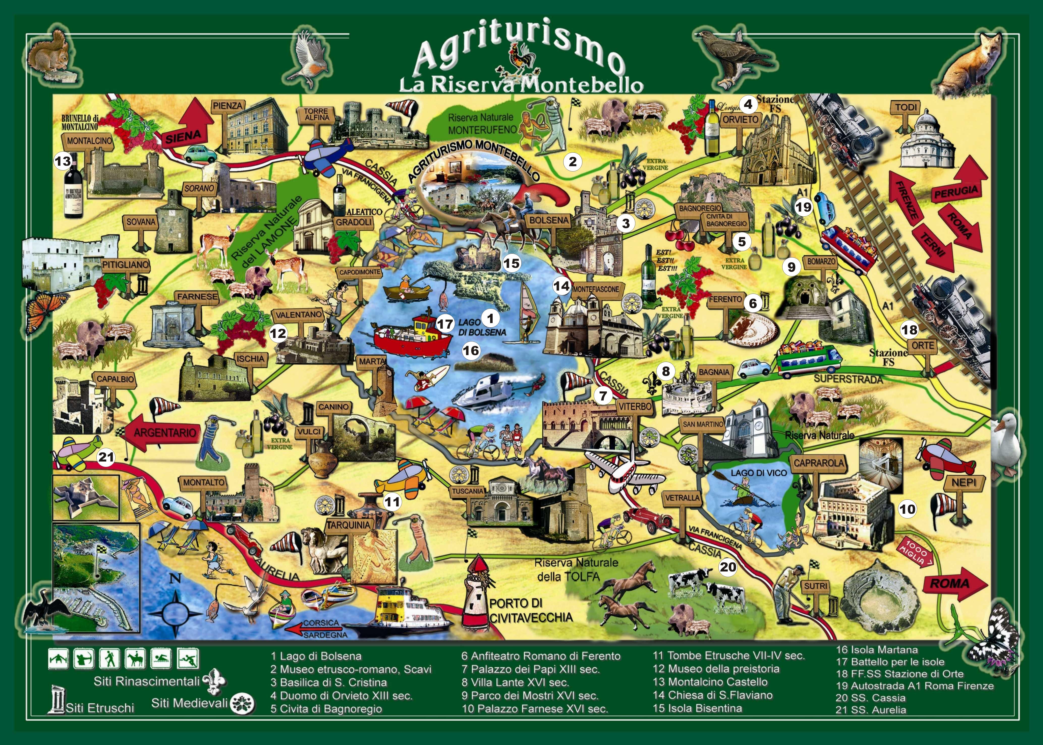 La tenuta dell'agriturismo si estende a pochi passi dal Lago di Bolsena, con vista sull'antico borgo e sul castello. La provincia di Viterbo è un crocevia importante per il turismo nel centro Italia, infatti siamo molto vicini ai confini con Umbria e Toscana. Nei dintorni potrete visitare molte località, caratterizzate da monumenti storici, necropoli etrusche e musei, consigliamo Gradoli e il Palazzo Farnese, il Museo e le necropoli di Tarquinia, il Museo e il Castello di Vulci, il quartiere medievale di Viterbo, il ricco Museo della Preistoria di Valentano, Orvieto con il suo splendido Duomo, Villa Lante della Rovere a Bagnaia, il Parco dei Mostri di Bomarzo, Civita di Bagnoregio "Il paese che muore", ed ancora Acquapendente, Sorano e Pitigliano, Marta, Montefiascone e le isole del Lago di Bolsena.