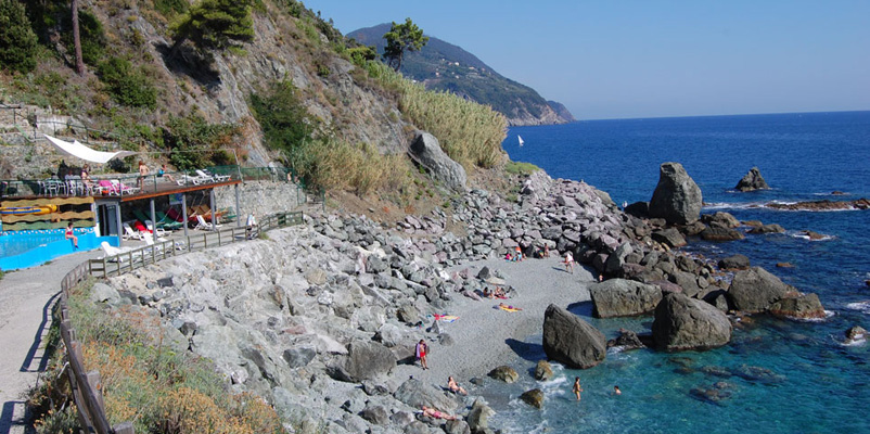 La struttura si affaccia sul mare con tre piccoli golfi ad ovest del Parco Nazionale Marino delle Cinque Terre. I fondali sono ripidi, rocciosi vicino alla costa e sabbiosi in profondità, hanno una bellezza sorprendente per la presenza di varie specie di pesci e piante acquatiche. La spiaggia si raggiunge col viottolo che dal ristorante porta al mare oppure dalla scalinata. È una piccola baia di ghiaia tra gli scogli, dall'acqua trasparente. Una barriera di massi crea una pozza per i bambini e ripara la spiaggia dalle mareggiate. Nel solarium con doccia si può prendere il sole ed alcune amache al coperto consentono un relax rigenerante.