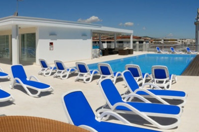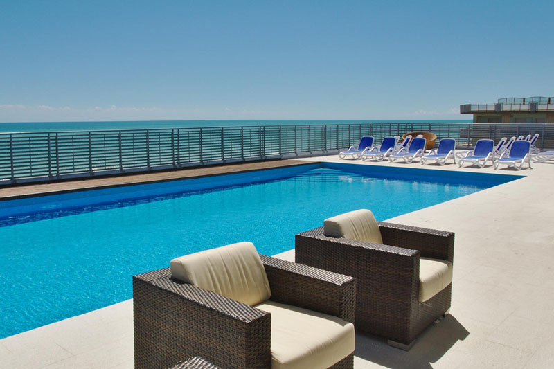 Fiore all'occhiello del nostro Hotel ad Alba Adriatica è la terrazza panoramica con piscina. Questo bellissimo specchio d'acqua, ubicato al quinto piano della struttura, si affaccia direttamente sul mare e sulle montagne del Gran Sasso. La piscina è circondata dalla terrazza panoramica attrezzata con lettini, divani, angolo bar, docce, servizi igienici e tutto l'occorrente per piacevolissimi momenti di relax. In questa fantastica vacanza in Abruzzo avrete la sensazione di viaggiare su una nave da crociera con musica, divertimenti ed una vista mozzafiato sul mare.