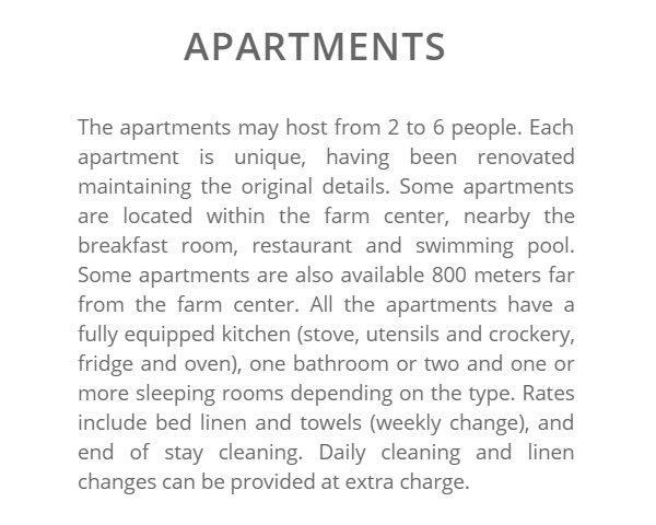 Our guests can opt for 14 apartments and 9 rooms, located within the farmsteads or among the lanes of the hamlet. This ambiences have been obtained from the houses where lived the peasants and nowadays they maintain the ancient characteristics. The apartments are provided with every comfort and they are composed of living room with kitchenette totally equipped, one or two bathrooms and one or two bedrooms. Moreover, these apartments make available an external private area with table and chairs, ideal to spend pleasant moments of relax in the open air. The car park is very close to the accommodation.
